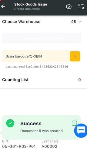 once complete with all the scanning click on the “Create documents in SAP” to process the Stock Goods Receipt.