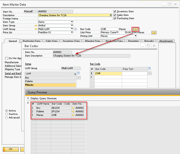 In the Item Master Data screen, you can configure the UoM groups and their associated barcodes for an item. Here's what you need to do: