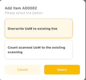 This option changes the original UoM set at the item level and starts counting the quantity according to the new UoM. If the line already has a quantity, the scanner converts the existing quantity based on the new scanned UoM.